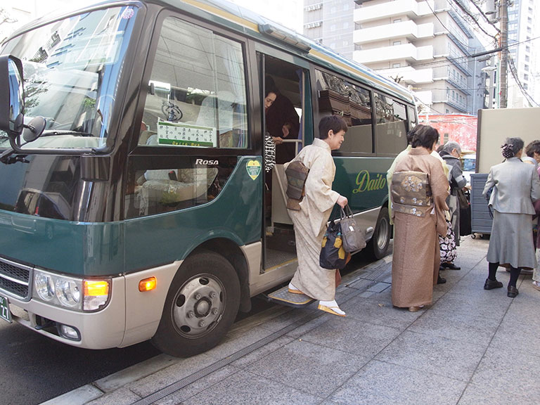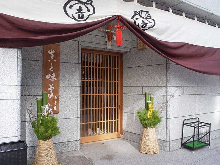 毎年、年酒席と副席を花外楼さまと交互で務めることになっており、今年は高麗橋𠮷兆が年酒席。今宮戎神社に設けられた副席(拝服席)でお茶を戴いたあと、高麗橋𠮷兆の年酒席にてお食事、そして今宮戎神社参拝というルートで、当日は巡回バスも運行。正面玄関前は、お客様のお出迎えとお見送りを繰り返す慌ただしさでしたが、これも新年ならではの賑わいの光景の一つです。