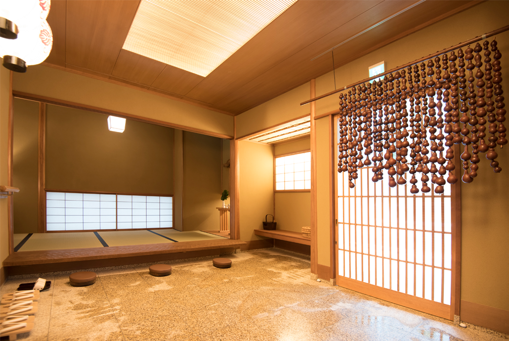 腰掛けや天井の照明といった細部を含め、旧店舗の慎ましやかな佇まいを踏襲した玄関ホール。𠮷兆のトレードマークになっていた千成瓢箪を連ねたのれんも、旧店舗から引き継ぎました。奥には恵比寿・大黒が祀られています。