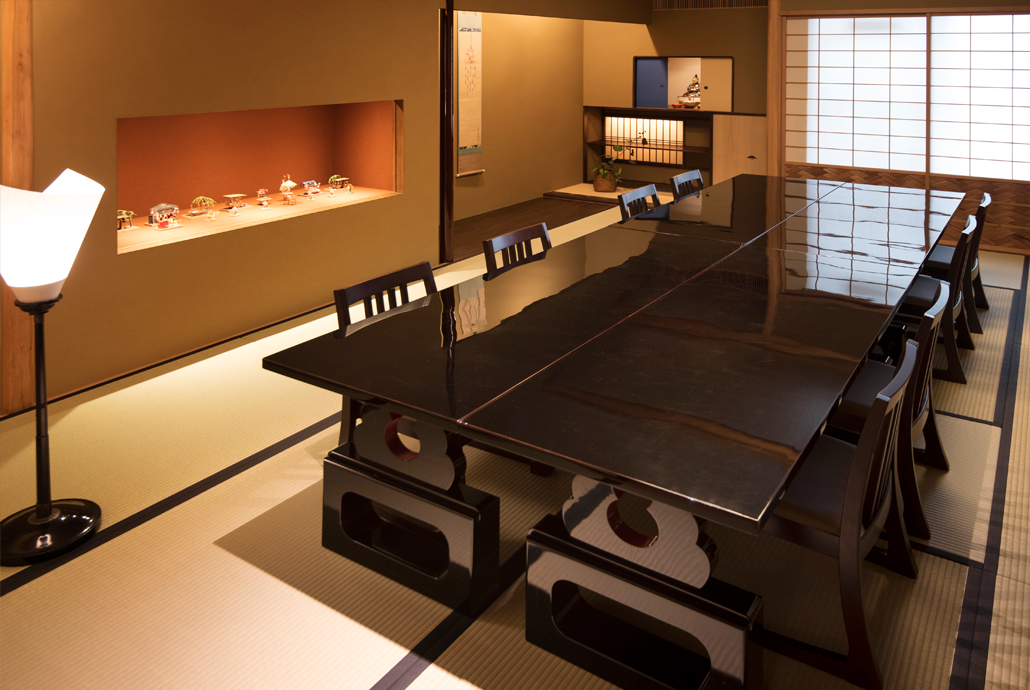 能舞台が設えられた大広間を継ぐ、店内で最も大きな広間。象徴的な松竹梅の板絵を同じ構成で再設置し、背面の立派な櫛型障子窓と、旧店舗を手がけた数寄屋棟梁の平田雅哉が特にこだわったという、奥行きの深い床の間も再現されました。正面を飾る長さ2間半の見事な透かし彫りの欄間は、かつて1階の福禄の間にあったものです。